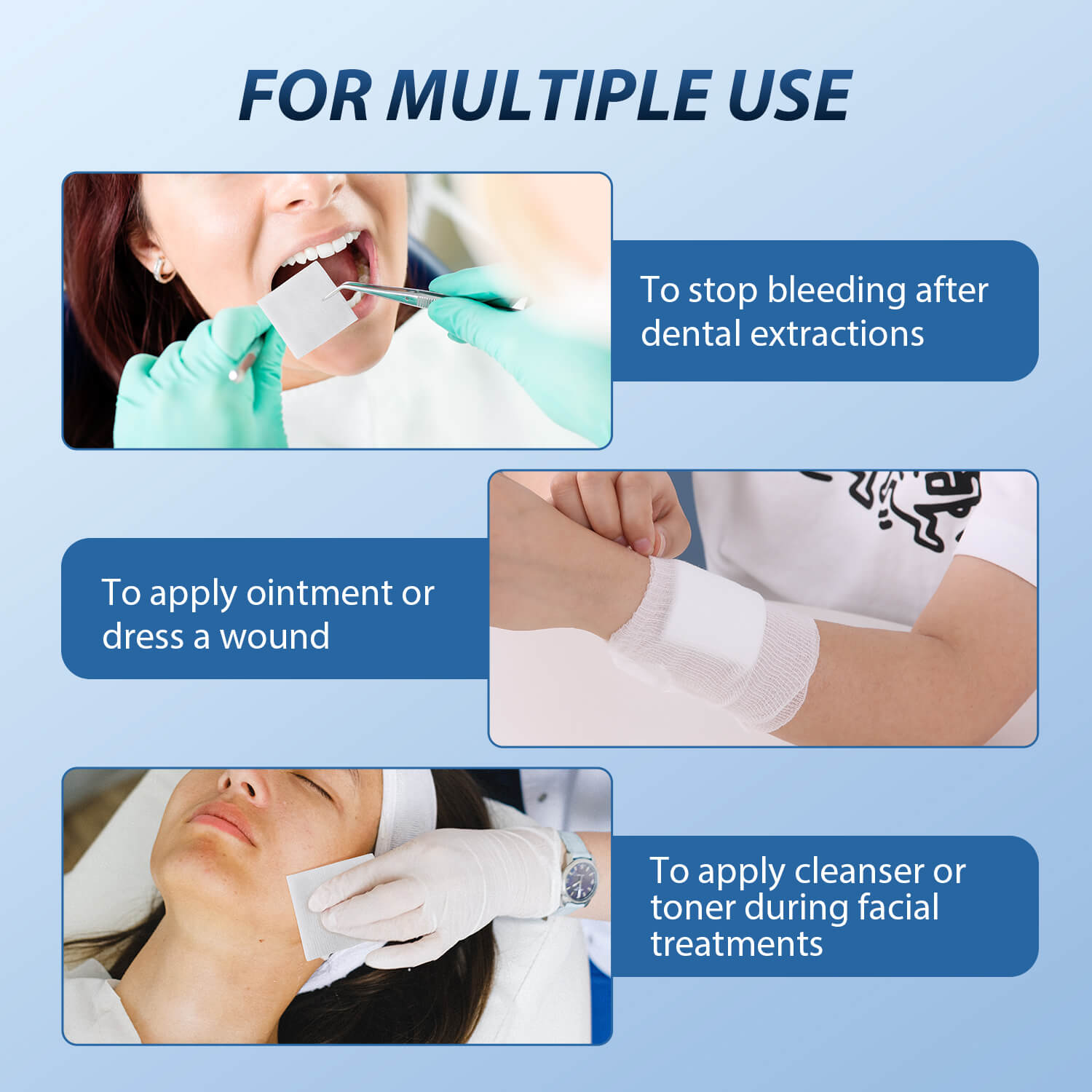 Dental Gauze Pads Non-Woven Sponge 4-Ply Non-Sterile 3 Sizes 200pcs/Bag. Size 2"x2" 3"x3" 4"x4" in available. Premium 30gsm medical-grade non-woven fabric, soft, tear-resistant and fully lint-free for clean professional use. Safe pure white material with no fluorescent agents or harsh chemicals, gentle on sensitive skin and wounds. Sealed bulk package contains 200 pieces, keeping hygiene fresh while lowering long-term usage costs.