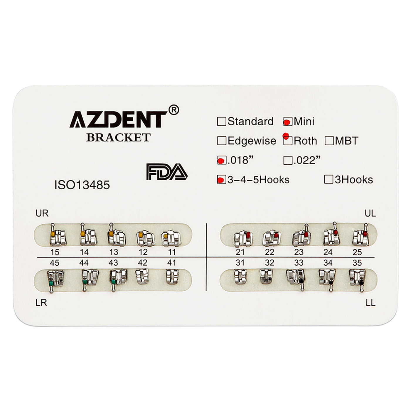 AZDENT Dental Mini Orthodontics Metal Brackets For Braces Full Size. 20pcs/Pack. Used for orthodontic teeth. Accurate placement, color coded ID system, true straight archwire system, ease of use, easy to replace arch wire and ligate, 80 gauge mesh base, low profile patient comfort.