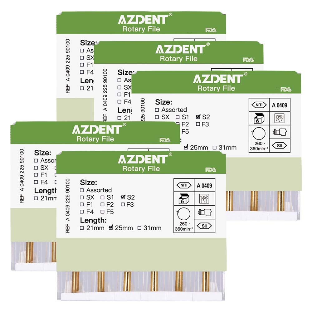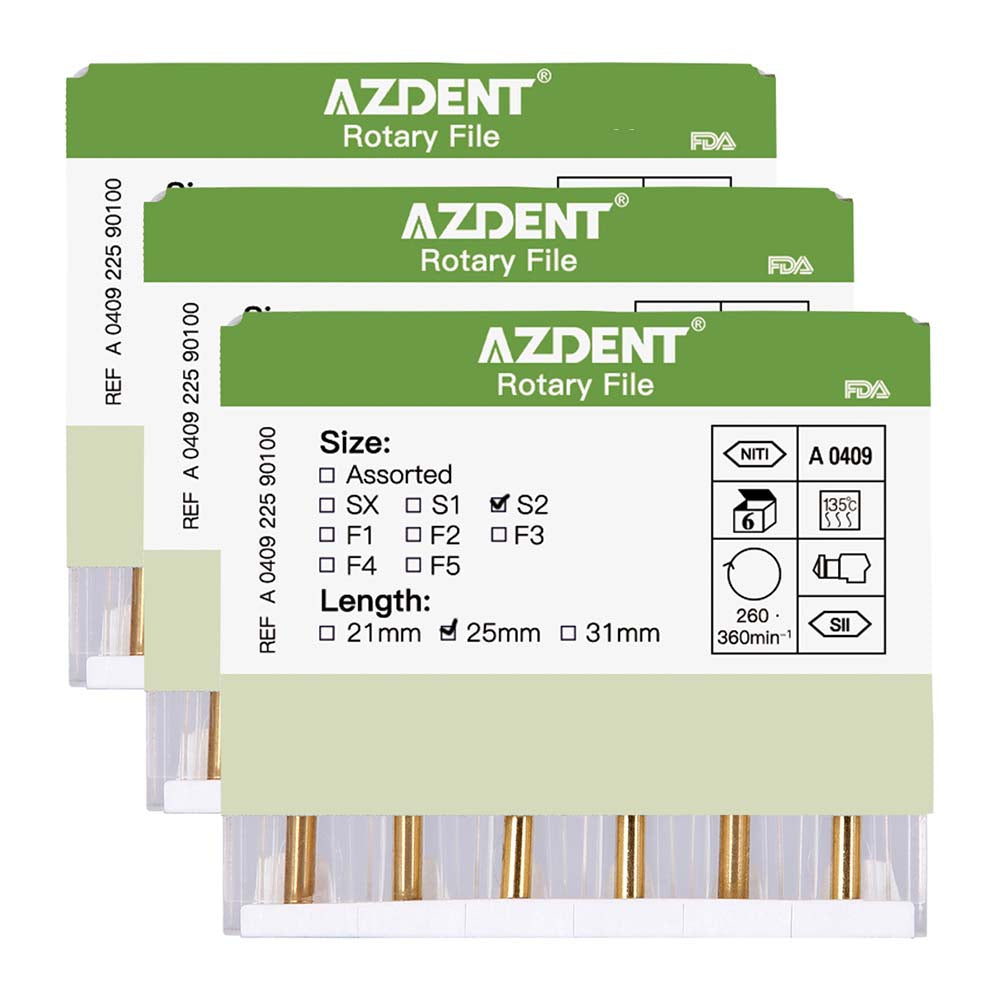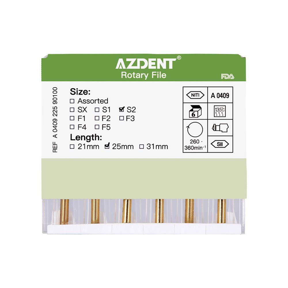 AZDENT Dental NITI Rotary Engine Files Heat Activated 25mm S2 6pcs/Pk. Compatible with all major rotary motors in the market. With precise processing technology, products in good flexibility, high quality cutting efficiency and fracture resistance.
