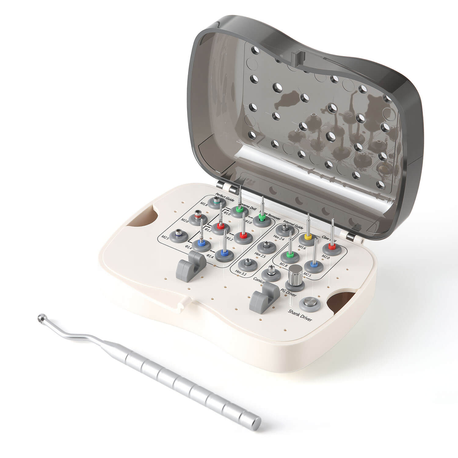 Dental Universal Implant Screw Removal Kit. Used for oral implant treatment,to remove broken implant screws. Remove the fractured screw fast and safely. Applicable to various implant system. 134°C Autoclavable.