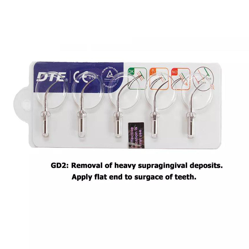 Woodpecker DTE GD2 Ultrasonic Scaler Tips 5Pcs/ Set, DTE(Compatible with SATELEC and NSK), Applicable for: D5 LED, D7/D7 LED, S6/S6 LED, D600/D600 LED. GD2 tip is to remove supragingival heavy calculus, apply flat end to surgace of teeth. High Quality Stainless Steel. Autoclavable. FDA&CE Certificated.
